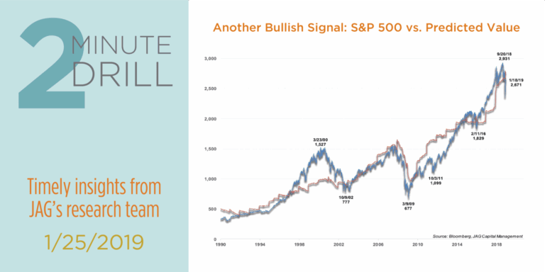The charts above point out yet another positive observation. By performing a simple regression, we can determine a “predicted value” for the S&P 500 and compare it to the actual level of the index. What jumps out at us is the fact that the recent correction has knocked the S&P 500 down below its predicted value. In fact, on January 3, the index had fallen more than 12% below its predicted value, the lowest such reading since 2013. We caution that this is far from a perfect timing signal, as the index has spent multi-year periods trading well above the predicted levels indicated by the regression (i.e. the late ‘90’s, and 2015-2017). Similarly, investing in early 2008 – when the S&P dipped below its predicted value – would have been an extremely painful entry point. That said, outside of recessions, this indicator has flagged important market bottoms reasonably well. January ’95, March ’03, late ’08, and October ’11 are examples of instances which proved to be attractive entry points for stock investors. We are cautiously optimistic that we could currently be in the midst of yet another positive investment backdrop for longer-term investors.