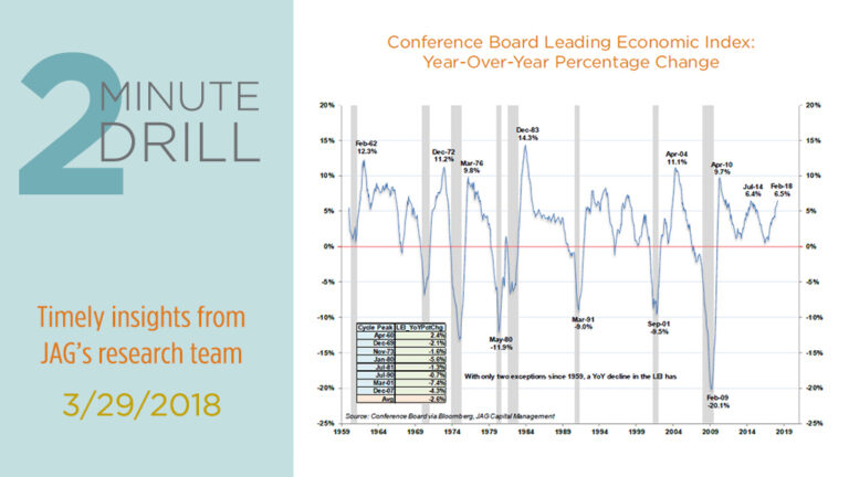Recent price volatility has kicked many stocks into correction territory (i.e. down 10%+ from recent highs), which is causing some observers to worry that the equity market is discounting future weakness in the broader economy. While anything is possible, we don’t see any tangible signs of a recession on the near-to-intermediate horizon. Note that the Leading Economic Index (LEI) has increased by 6.5% year-over-year and is breaking out to multi-year highs. Past economic cycle peaks (noted in the table inside the chart) have generally occurred after the rate of growth in the LEI has contracted into negative territory. Barring an unexpected (and rapid) deterioration in the economy, we tend to view the market’s correction as more of an opportunity than a threat.