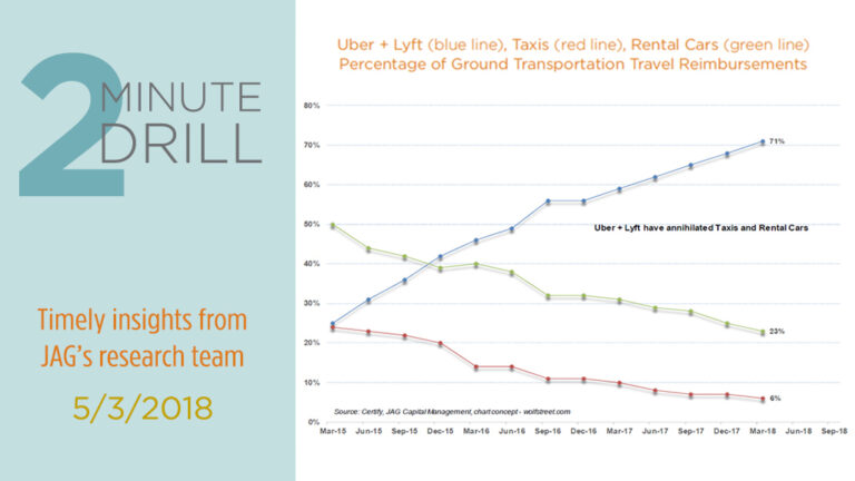Rarely have we come upon such a simple, stark picture of rapid technological disruption as we find displayed in this chart. As recently as early 2015, taxi and rental car receipts represented a combined 75% of all corporate ground transportation travel reimbursements in the U.S. By late 2016, Uber and Lyft reimbursements had grown to more than 50% of the total. Less than two years hence, the market share of taxi and rental car receipts have collapsed to less than 30%, while Uber and Lyft’s combined shares have exploded to 71%. Although neither Uber or Lyft are public companies (yet), we think there are still some important takeaways for investors. First, given that the shares of both Hertz and Avis-Budget have vastly lagged the broader equity market over the past three years, investors should be careful when evaluating apparently “cheap” stocks that operate threatened business models. Secondly- and more broadly – we think technological disruption is arguably occurring faster today than at any time in the past. If we are correct in this opinion, it is likely that investors should expect more incumbent business models to be quickly cast aside by technological advances in the future. This will create both phenomenal opportunities and risks for long-term investors. Stated another way, true disruptors could experience outsized gains, while “disruptees” could experience rapid and dramatic valuation declines.