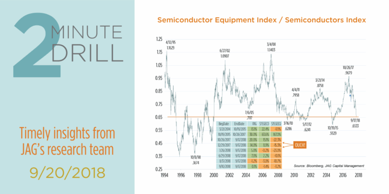 There are two broad ways to invest in semiconductors. One can invest in the chip companies themselves (i.e. Intel, symbol INTC), and/or one can invest in semiconductor capital equipment companies (i.e. Applied Materials, symbol AMAT). The former group of companies produce and sells semiconductor chips. The latter group makes the incredibly complex and expensive machines that semiconductor companies use to produce those chips. Even though these groups are close relatives, historically they have tended to exhibit divergent stock performance. In the graph above, a rising line indicates that semiconductor equipment stocks are outperforming chip stocks. A falling line indicates periods of relative underperformance by the equipment stocks. Note from the table that the Semiconductor Equipment industry has dramatically lagged the broader market and the Semiconductor industry since last October. In fact, year-to-date through 9/17/18, Semiconductor Equipment stocks have declined by more than 15%, putting them squarely in correction territory. By comparison, the Russell 1000 Growth index has gained over 14% so far this year. Holy underperformance, Batman!