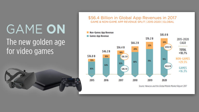 Over the past four decades, video games have emerged from basements and coin arcades into the global mainstream. The first video games sported crude black and white, two dimensional graphics. Today’s game offerings include premium console and PC-based titles featuring huge, photorealistic worlds that can take literally years to explore, as well as a vast array of smartphone-enabled mobile games. As the technology driving them has advanced, video games have also become an increasingly ubiquitous and profitable entertainment medium. The number of video gamers worldwide has exploded from 100 million to over 2 billion since 1995, implying that more than 70% of the world’s 3.7 billion internet users are also gamers (source: Statista). More importantly for investors, the video game industry now generates a large and growing stream of revenues totaling more than $100 billion annually (source: Newzoo).