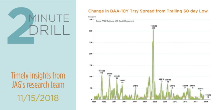 The current correction in stocks began in late September and accelerated into late October, and it brought the S&P 500 down as much as 9.5% in the process. These charts show the path of yield spreads for both BAA-rated (investment grade) and CCC-rated (“junk”) bonds over the past 20+ years through November 9. Perhaps unsurprisingly, both charts show that yield spreads have recently widened along with equity market volatility. But importantly, we note that spreads have thus far remained much more subdued than in prior corrections in 2011, 2012, 2014, and 2016. We will be watching this data closely over the next several weeks. If the widening in yield spreads remains contained, we think the odds would favor continued stabilization in the broader stock market averages. On the other hand, if spreads widen dramatically, it is likely that stocks will have a rougher go of things in the near/ intermediate-term.