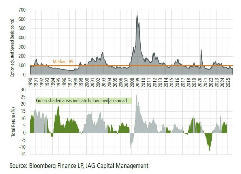 In last quarter’s Insight, we examined the relationship between yield levels and forward return outcomes, illustrating how higher absolute yields improve the odds of favorable results over time. This quarter, we turn to a related but more nuanced factor: credit spreads. Our analysis focuses on the Bloomberg US Intermediate Corporate Index.
