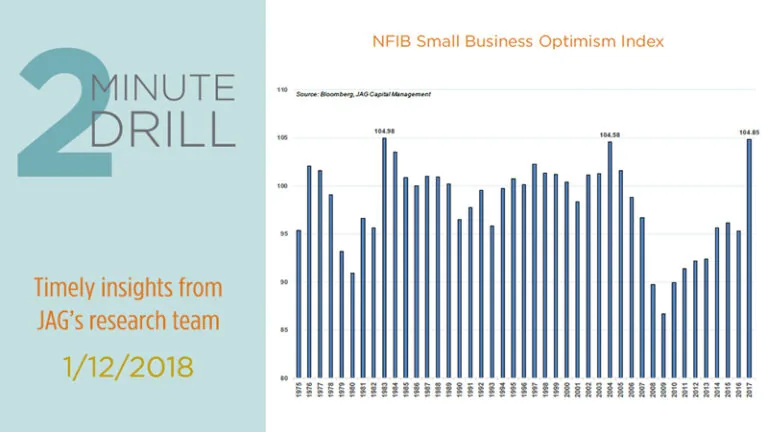 The mood on Main Street is very bright as we enter 2018. Small business owners are increasingly enthusiastic about the economy and their own business prospects. The NFIB (National Federation of Independent Business) Small Business Optimism Index recently ramped to its highest level since 1983, outstripping the pre-Great Recession high that was set in 2004. This may indicate that “animal spirits” could be poised to stimulate economic activity in 2018.