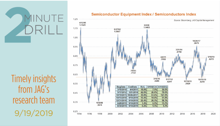 For better or worse, we were not as prescient in forecasting overall semiconductor market billings. In that same July 2018 note, we stated that we “did not see a cycle peak on the near/intermediate-term time horizon.” That prediction turned out to be misplaced, as global semiconductor billings fell more than 20% between October 2018 and July 2019. With the full benefit of hindsight, it now appears that the chip equipment makers spent most of 2018 discounting the coming lull in chip orders. Similarly, the equipment makers have rallied hard since last fall, probably in anticipation of a recovery in chip orders that appears to be on tap for the last several months of 2019. The takeaway: while there is probably more room for semiconductor equipment stocks to run into early 2020, we are looking to get more constructive on chip stocks over the next three to six months.