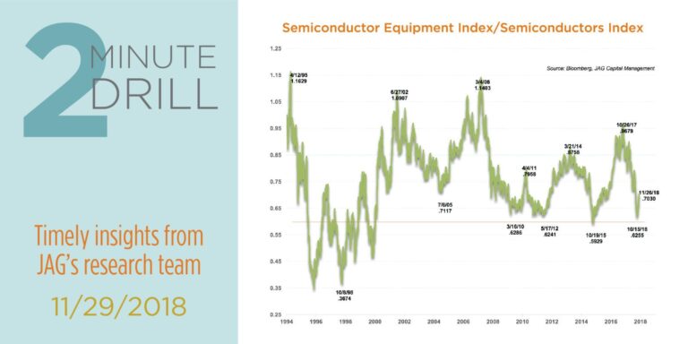 There are tentative technical signs that another up-cycle in absolute and relative performance could be at hand for the Semiconductor Equipment Index. We note that so far in November, the Semiconductor Equipment Index has generated double-digit gains, compared to veritable flat-line performances by the Russell and the Semiconductor indices. Skeptics might be inclined to call this a “dead cat bounce,” and they could be right. Thy might correctly point out that the global semiconductor industry seems to be entering a soft patch, driven by supply gluts and poor price/margin dynamics for many of the more commoditized chip categories like NAND and DRAM. Bears might also note that semiconductor companies manufacture and sell their products through global supply chains, many of which wind through China. This arguably makes the entire industry more susceptible to trade tensions and tariffs. We agree with all these observations, but we have learned from hard experience that cyclical stocks tend to build bottoms in the midst of poor fundamental news flow. By the time fundamentals are demonstrably more favorable, the upside investment opportunities are greatly diminished. We are not calling the bottom (yet), but we like the odds that select chip equipment makers could be an attractive source of alpha into 2019.